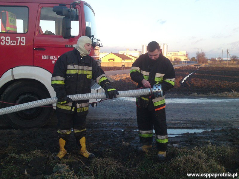 W dniu 23 lutego około godziny 16:30 zostaliśmy zadysponowani do miejscowości Kawęczyn w celu udrożnienia podtopionego terenu. Na miejsce przybył lekki samochód operacyjny Nissan Navarra oraz ciężki samochód IVECO. Po zapoznaniu się z sytuacją uruchomiliśmy 2 pompy szlamowe i pływającą pompę Niagarę, które wyrzucały wodę z zalanego terenu natomiast sami zajęliśmy się tworzeniem koryt ułatwiających spływ wody z zalanego terenu. Działania prowadziliśmy blisko przez 3 godziny, po zapadnięciu zmroku pracowaliśmy przy sztucznym świetle dostarczanym z naszego samochodu. Na miejsce akcji przybyło 13 strażaków z Ochotniczej Straży Pożarnej w Paprotni, z czego aż 5 własnymi środkami transportu na miejsce zdarzenia. Zalany teren został przez Nas sprawnie udrożniony.